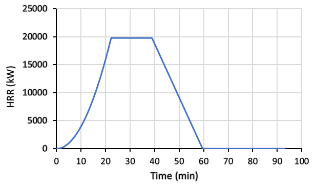 The decay is linear: \(\dot{Q}(t) = HRR_{max} \cdot \frac{t_{tot} – t}{t_{tot} – t_{decay}}\).